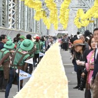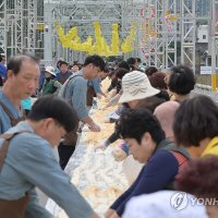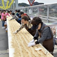 (공주=연합뉴스) '2023 대백제전' 세부 프로그램으로 7일 충남 공주시 금강철교 위에서 열린 '인절미 축제'에서 시민들이 인절미를...축제에서 '단일 장소에서 동시에 만들어진 가장 긴 인절미' 부문 한국기록원 공식 최고 기록을 수립했다고 밝혔다. 2023.10.7...