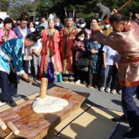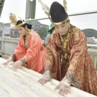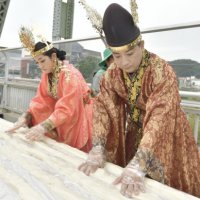 '2023 대백제전' 세부 프로그램으로 7일 충남 공주시 금강철교 위에서 열린 '인절미 축제'에서 무령왕과 왕비로 선발된 시민이 인절미...이 축제에서 '단일 장소에서 동시에 만들어진 가장 긴 인절미' 부문 한국기록원 공식 최고 기록을 수립했다고 밝혔다. 사진...
