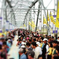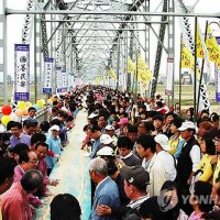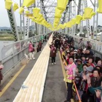 만들기 도전’ 참가자들이 도전에 성공한 후 환호하고 있다. 공주시는 이 행사를 위해 금강철교 위에 탁자 180여개를 배열한 뒤 그 위...함께 시민·관광객 200여명이 투입됐다. 한국기록원은 기록 도전 규정 준수 여부와 인절미 제작 과정, 길이 등을 측정한 뒤...